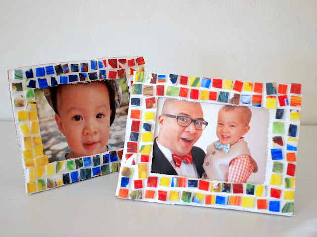 Grab some foam plates to create little tiles that look like mosaics – but aren’t! Paint and then attach to the front of frames (that you can make, or use wood frames).